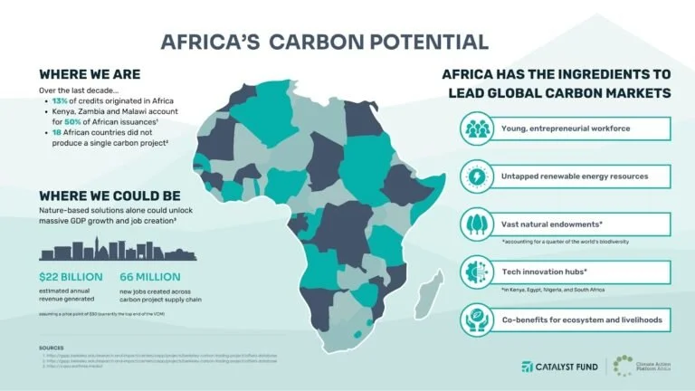 Africa is poised to become the future of carbon supply, according to the Catalyst Fund’s Ash Berman and Malika Anand, and the continent’s supply of carbon credits cannot get to market fast enough. According to the analysts: “Both the voluntary carbon market (VCM) and compliance markets more than doubled in value between 2020 and 2022 as an increasing number of corporations and governments in the Global North seek to execute voluntary or mandatory Net Zero commitments. In 2022, $2 billion of carbon credits were traded on the VCM, more than doubling since 2020. The volume of credits required globally is expected to increase at least 20x by 2035, with 30 to 40x needed for scenarios consistent with the Paris Agreement on climate change. To harness this opportunity, we need to establish African markets as attractive destinations for private sector investment, and support African innovators to navigate the carbon value chain.”
